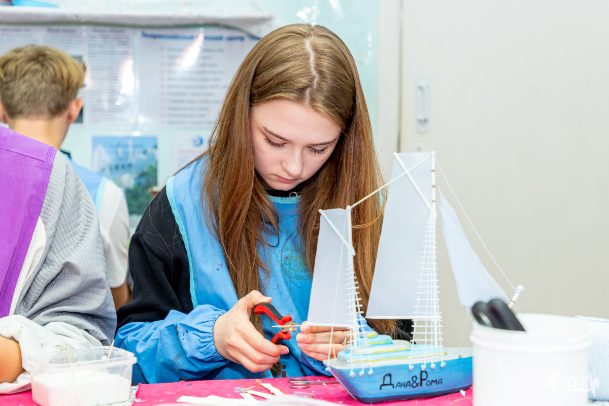 Андрей Комоедов из Алтайского края поделился впечатлениями от занятий в мастерской «Океанская верфь»: «Занимаясь созданием модели корабля из европлекса, мы выполняли целый ряд операций: разметку, резку, обработку наждачной бумагой, шпаклёвку, оклейку и покраску корпуса. Затем приступили к изготовлению трёхмачтового судна с размерами мачт 25 см, 27 см и 20 см соответственно. Для прочности мачты дополнительно скреплялись нитками, имитируя балочные конструкции парусника. Впервые создавая подобное изделие, я получил огромное удовольствие от процесса. Особое значение имеет тот факт, что парусный движитель экологически чистый, не требует топлива и двигается исключительно благодаря ветру. Таким образом, подобные занятия помогают задуматься о способах защиты окружающей среды и внести вклад в улучшение экологической обстановки».