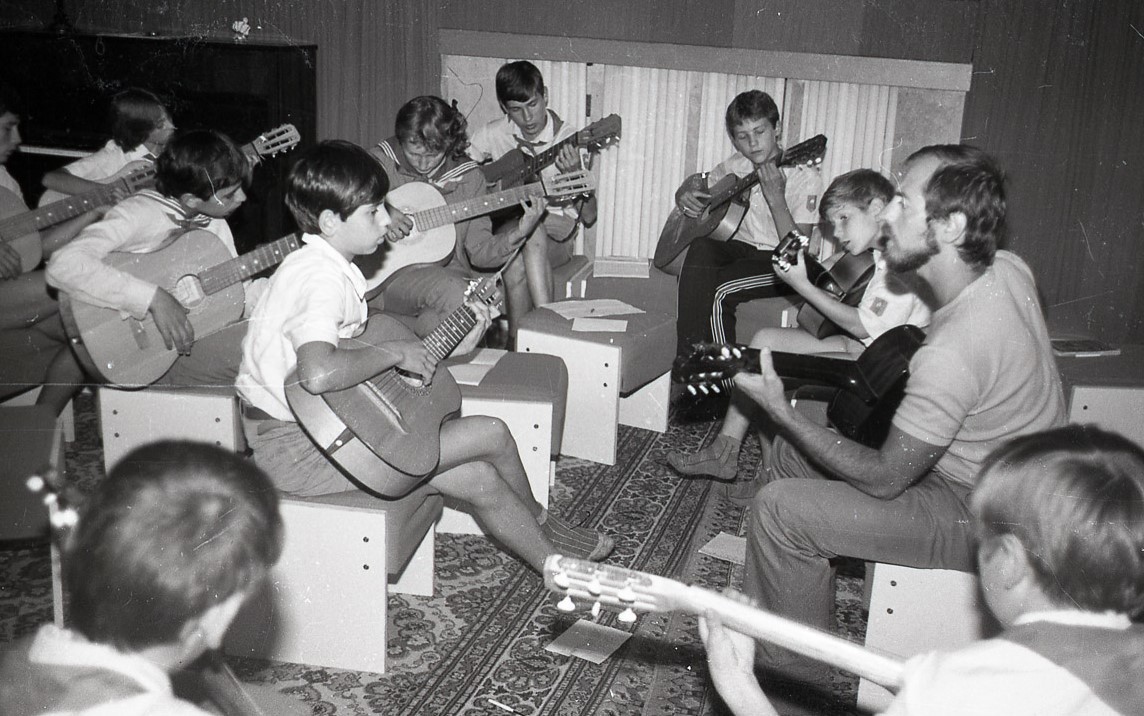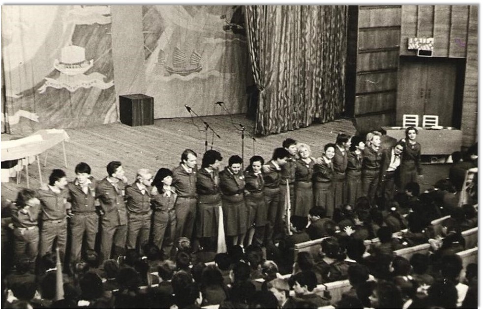 В 80-х – начале 90-х годов была замечательная традиция – перед началом дружинного дела все вожатые, в форме, с пионерскими галстуками на груди становились перед рампой и, положив руки на плечи, исполняли под гитару песни, которые тут же подхватывала вся дружина.